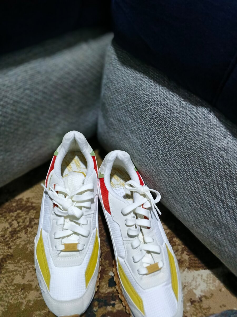 Chaussures de sport blanches avec accents jaunes et rouges, confortables et idéales pour le sport ou les activités quotidiennes.