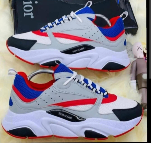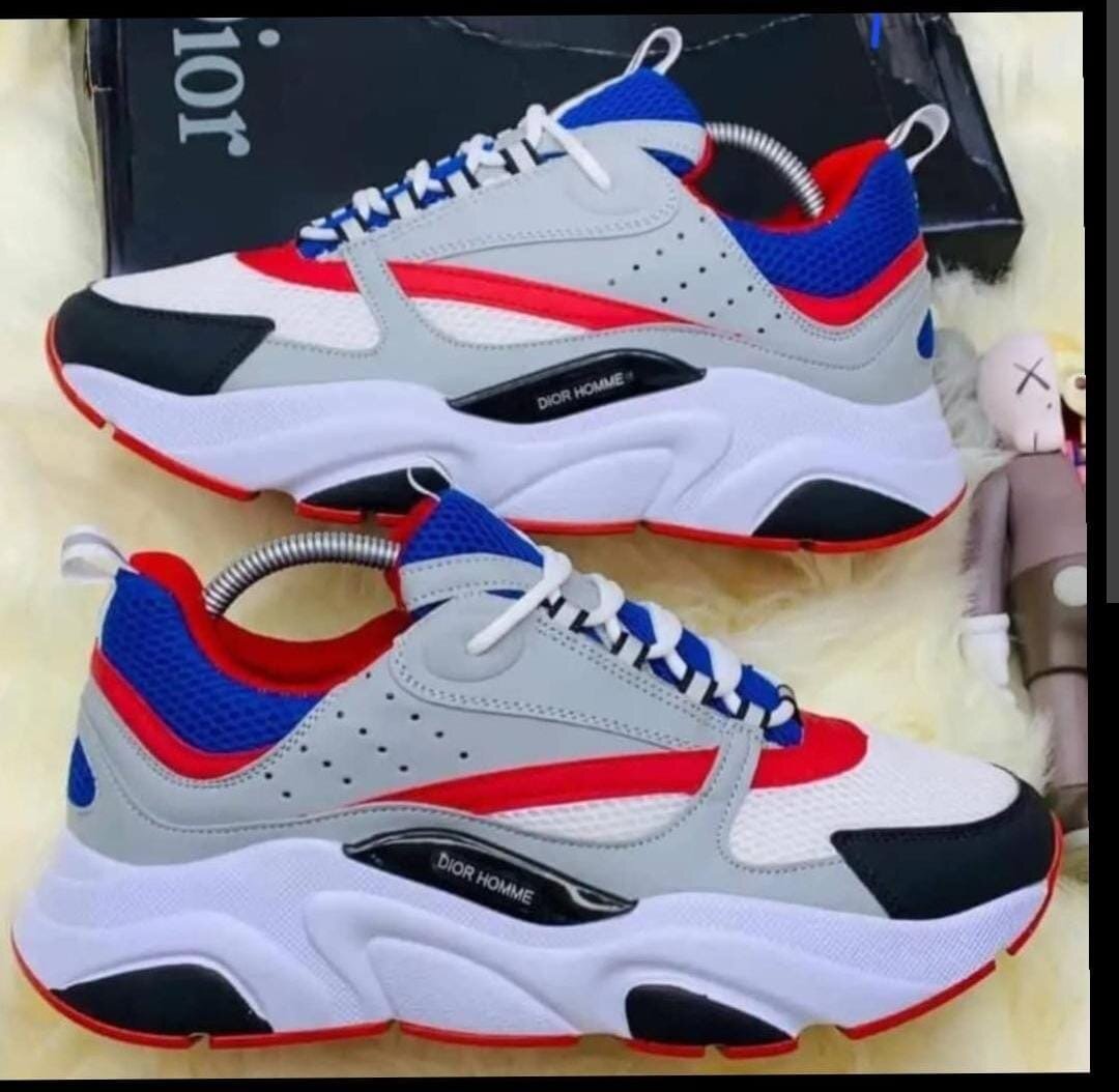 Découvrez ces baskets Dior Homme, parfaits pour un look urbain et élégant. Conçus pour les hommes modernes, ces chaussures allient confort et style avec des accents rouges et bleus.