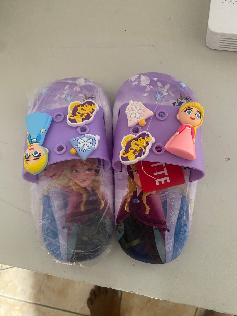 Chaussures de plage pour filles, violettes, ornées de décorations amusantes. Conçues pour le confort et la personnalisation.