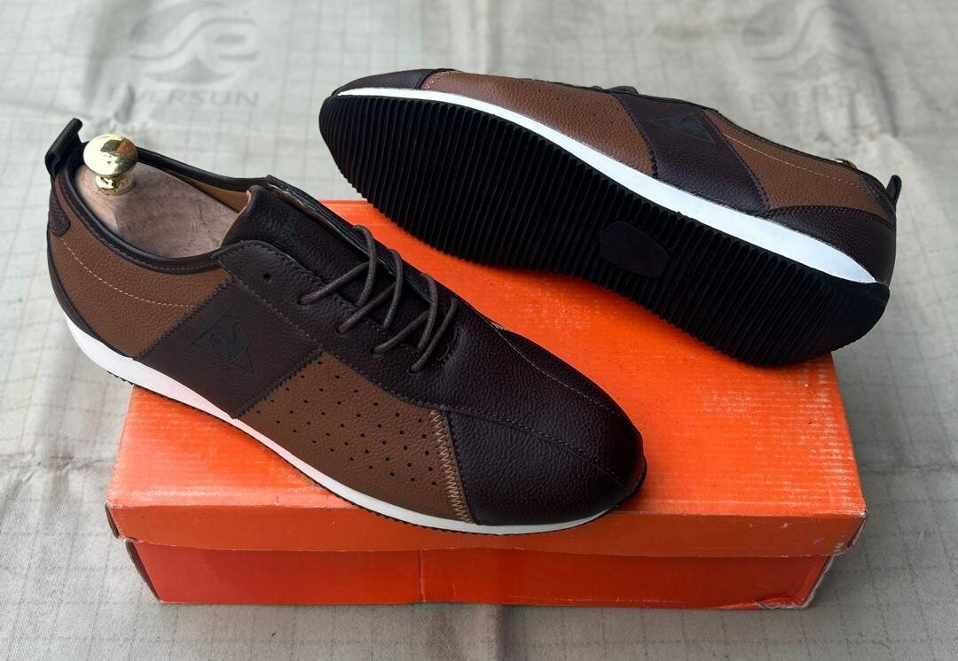 Chaussures décontractées pour homme en cuir marron et noir, semelle en caoutchouc, confortables et élégantes. Idéales pour une tenue quotidienne.