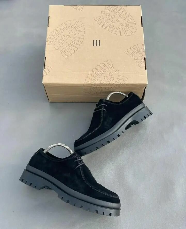 Chaussures masculines en cuir noir avec semelle épaisse grise. Conçues pour un usage quotidien, ces chaussures offrent confort et style. Idéales pour les hommes qui apprécient la qualité et l'élégance.