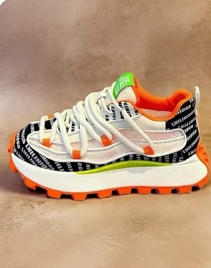 Découvrez ces baskets tendance avec une semelle épaisse orange et des lacets blancs. Conçues pour un usage quotidien, elles allient confort et style.