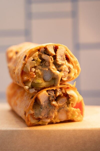 Nous vous proposons de savoureux chawarmas faits maison, garnis de viande hachée, frites, saucisson, salade, vinaigrette, aromates, ketchup... un vrai régal à chaque bouchée!"