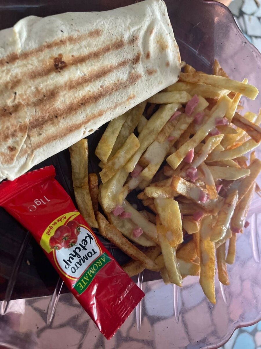 Découvrez notre délicieux chawarma grillé accompagné de frites croustillantes et d'un sachet de ketchup et d une boisson non alcoolisées