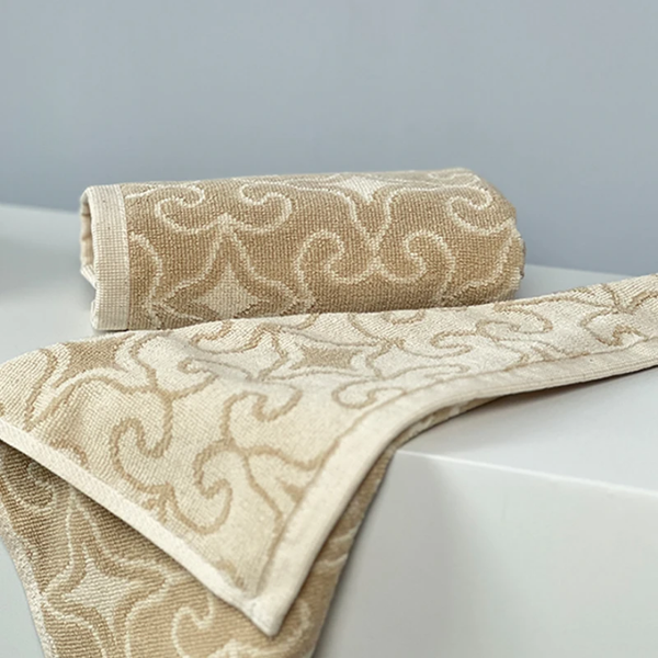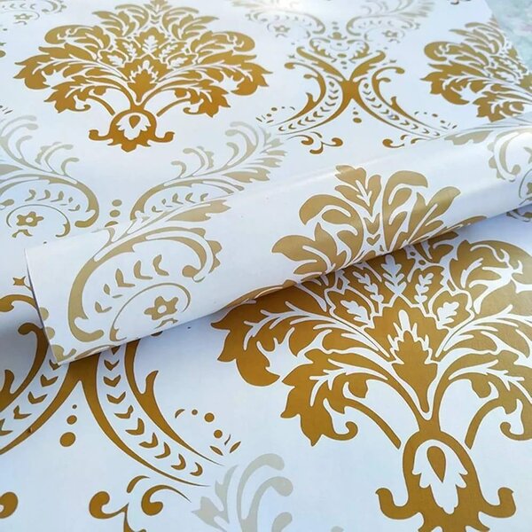 Élégant chemin de table en tissu gris avec motifs dorés . Pour une table de 6 places