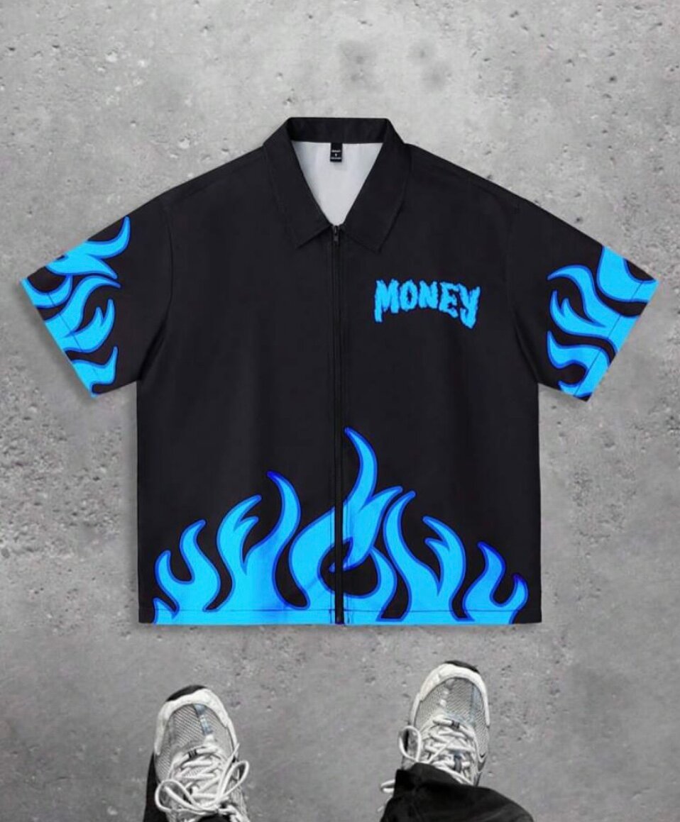 Chemise tendance avec motif flammes colorées. Design audacieux parfait pour un style urbain. Disponible en plusieurs couleurs pour un look unique et accrocheur.