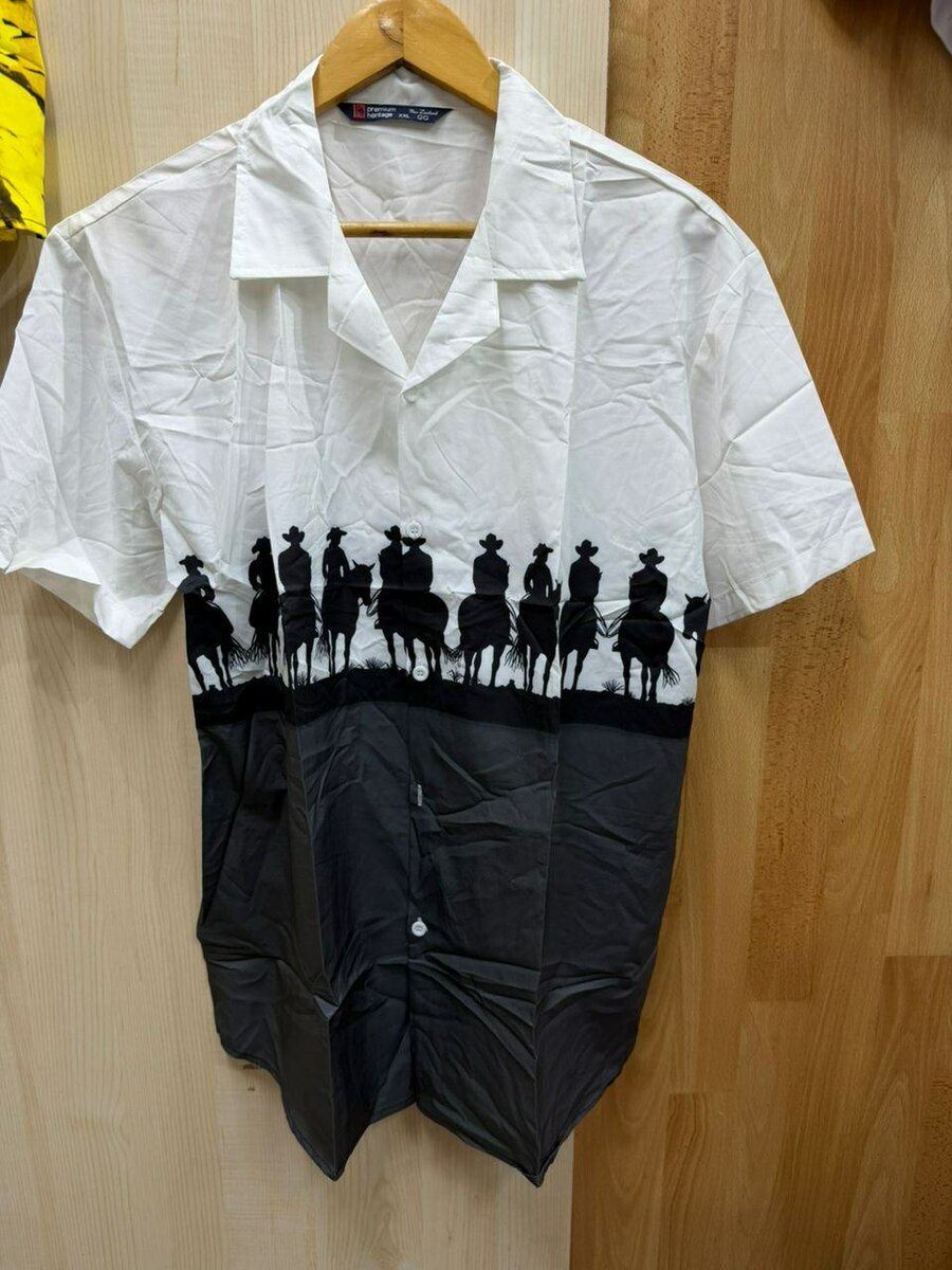 Chemise homme à manches courtes avec motif de cowboys. Fabriquée en coton confortable, idéale pour les sorties décontractées ou les événements à thème western. Facile à entretenir et à associer avec des jeans ou des shorts.