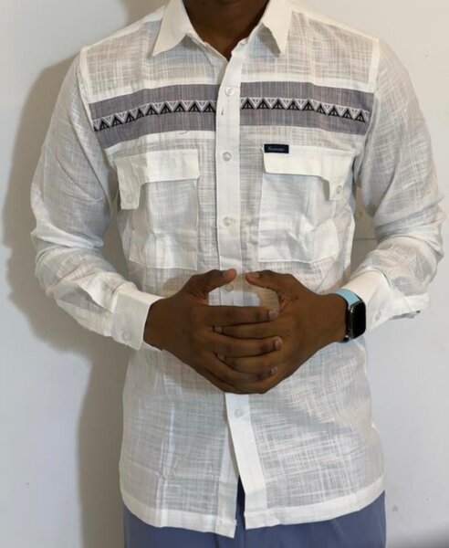 Chemise Classique chic (manches longues) : un parfait mélange de tissu raffiné et de broderies africaines. Idéale pour vos rendez-vous professionnels ou cérémonies.