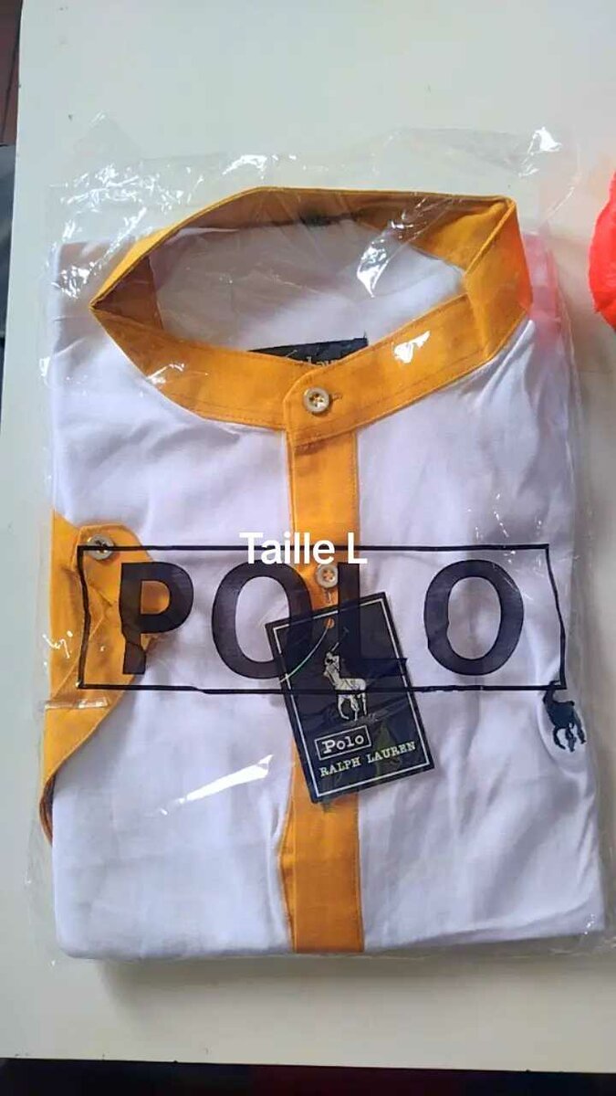 Élégante chemise Polo blanche avec col mandarin jaune contrastant. Taille L. Idéale pour un look décontracté et sophistiqué. Confortable et tendance pour toutes occasions.