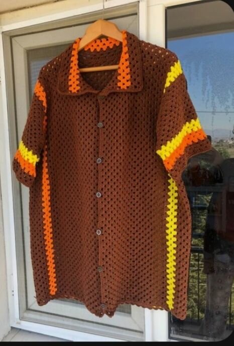 Découvrez notre chemise crochet pour femme et homme , un chef-d'œuvre artisanal aux tons marron, jaune et orange vibrant. Optez pour l'élégance bohème et le confort avec cette pièce unique!
