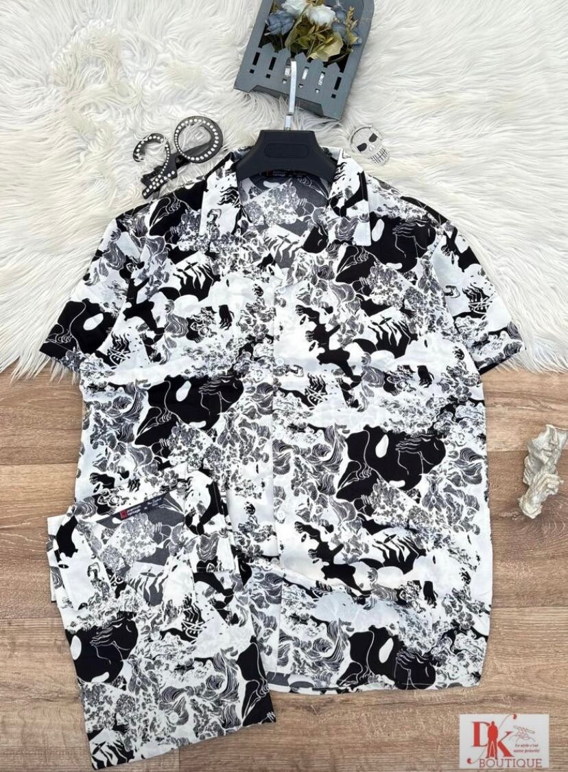 Cette chemise tropicale à manches courtes offre une élégance décontractée avec son motif imprimé audacieux en noir et blanc. Confortable et respirante, elle est idéale pour les journées estivales ou les vacances. Associez-la à un pantalon léger pour un look parfait de plage ou de promenade en ville.