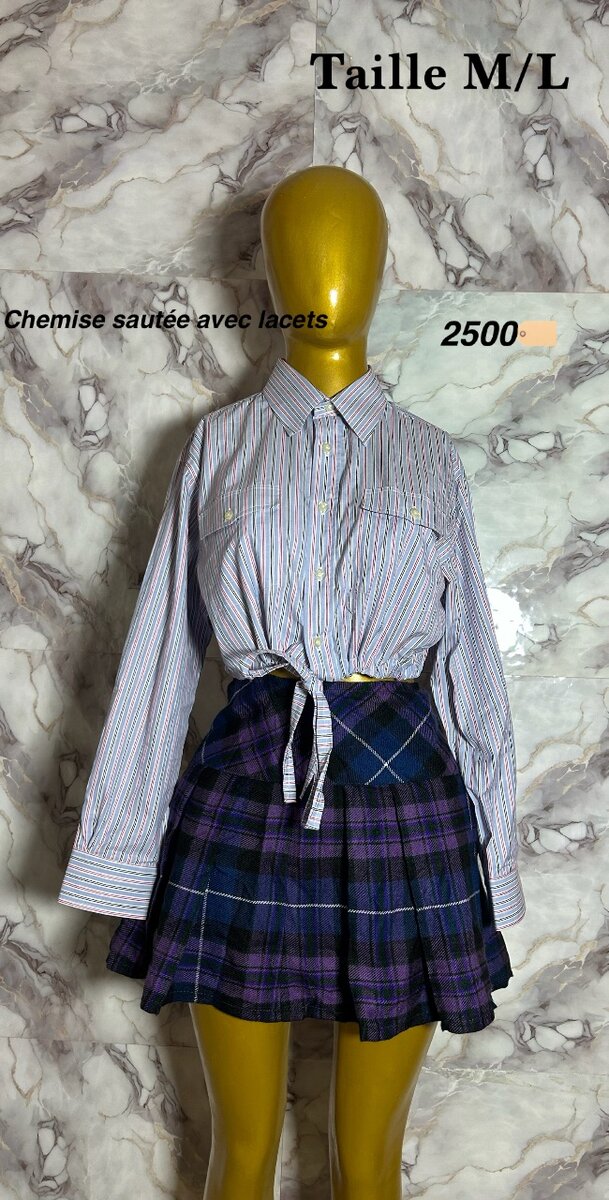 Craquez pour cet ensemble stylé de chemise croisée et jupe écossaise. Parfait pour un look chic et décontracté. Disponible en tailles S à M/L.