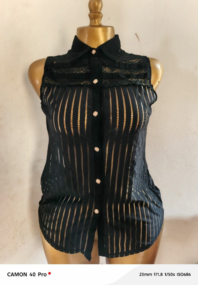 Adoptez un look chic et élégant avec ce chemisier noir sans manches en dentelle. Parfait pour des journées à la plage ou des soirées estivales. Sa coupe légère et aérée assure confort et style. Le choix idéal pour un ensemble sophistiqué et décontracté!