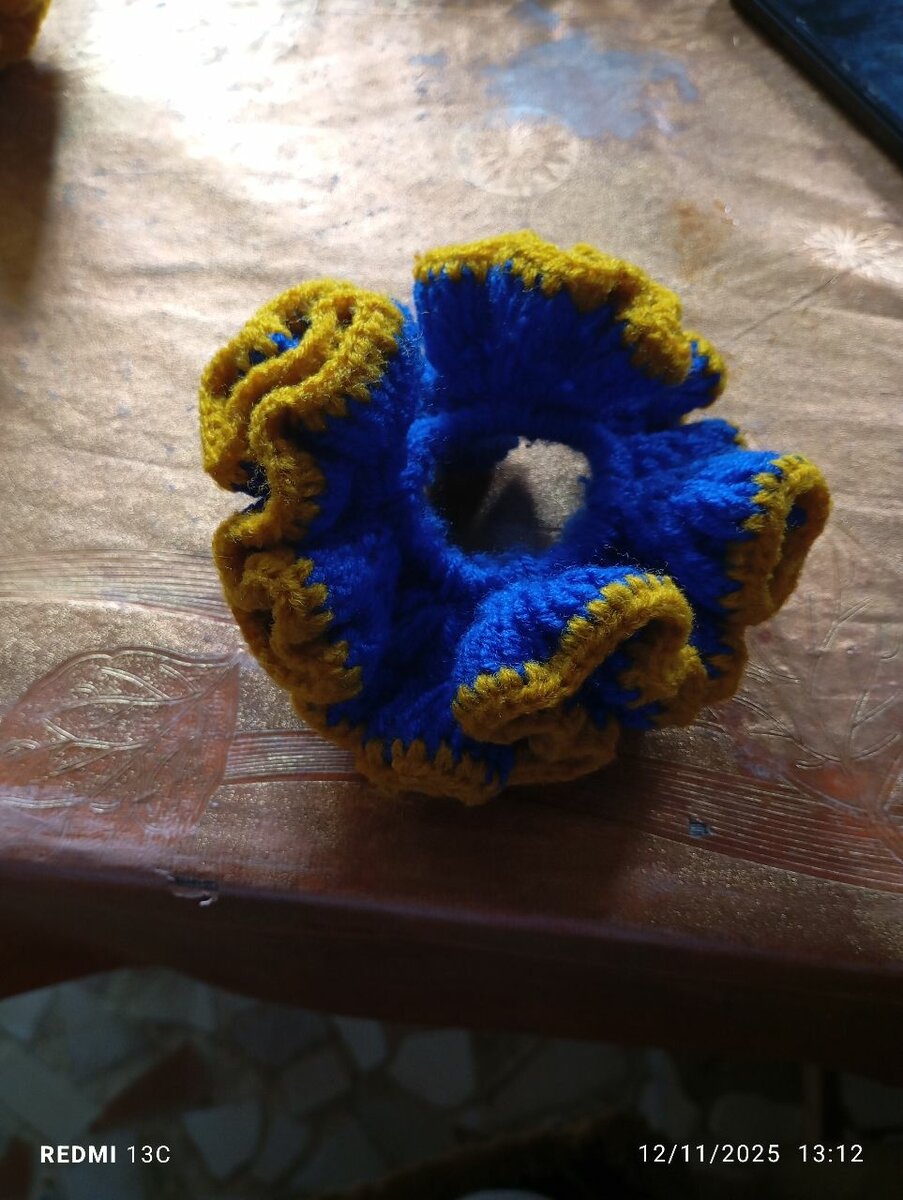 Ajoutez une touche de couleur à votre coiffure avec cette chouchou tricotée à la main en bleu et jaune. Douce et extensible, elle maintient vos cheveux en place sans les abîmer. Parfaite pour un usage quotidien ou pour accessoiriser vos tenues décontractées.