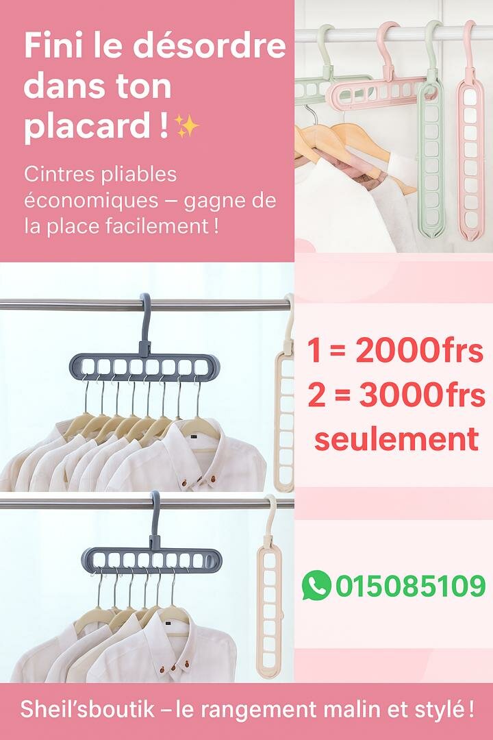 Optimisez votre espace avec ces cintres pliables ingénieux. Faciles à utiliser, ils sont idéals pour organiser votre placard tout en économisant de la place. Parfaits pour n'importe quel type de vêtements, ils ajoutent une touche de style et d'efficacité à votre rangement. Ne manquez pas cette solution pratique pour un placard bien ordonné !
