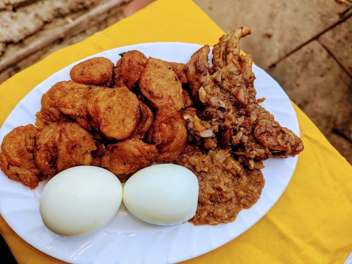 Découvrez une assiette exotique garnie de délices frits et d'œufs durs, parfaite pour un repas copieux ou un buffet.