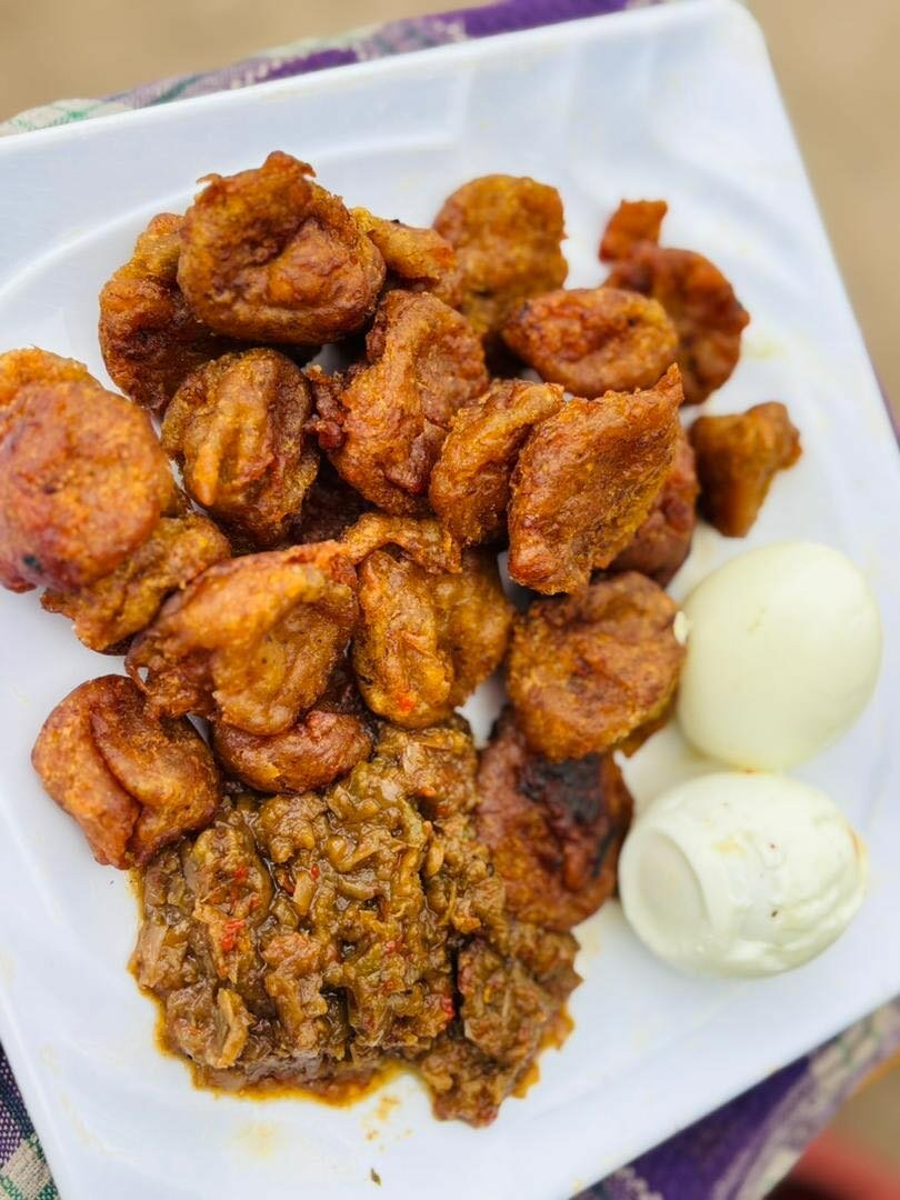 Savourez nos plantains frits croustillants, servis avec des œufs durs et une sauce épicée. Parfait pour un repas authentique et rapide.