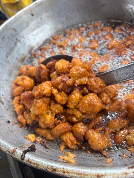 Claclo façon akan frit à l'huile rouge de chez nous accompagné d'œufs et de pattes de poulet.
