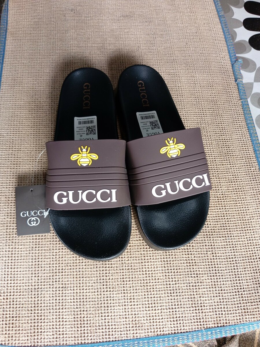 Ajoutez une touche de luxe à vos tenues décontractées avec ces claquettes Gucci ornées d'un motif abeille doré. Confortables et stylées, elles sont idéales pour la plage ou la maison. Un choix incontournable pour ceux qui apprécient la qualité et le design.