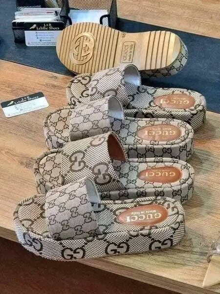 Claquettes Gucci marron à plateforme. Sandales tendance avec motif monogramme, idéales pour un look chic et décontracté. Semelle épaisse confortable. État neuf. Pointures selon disponibilité.