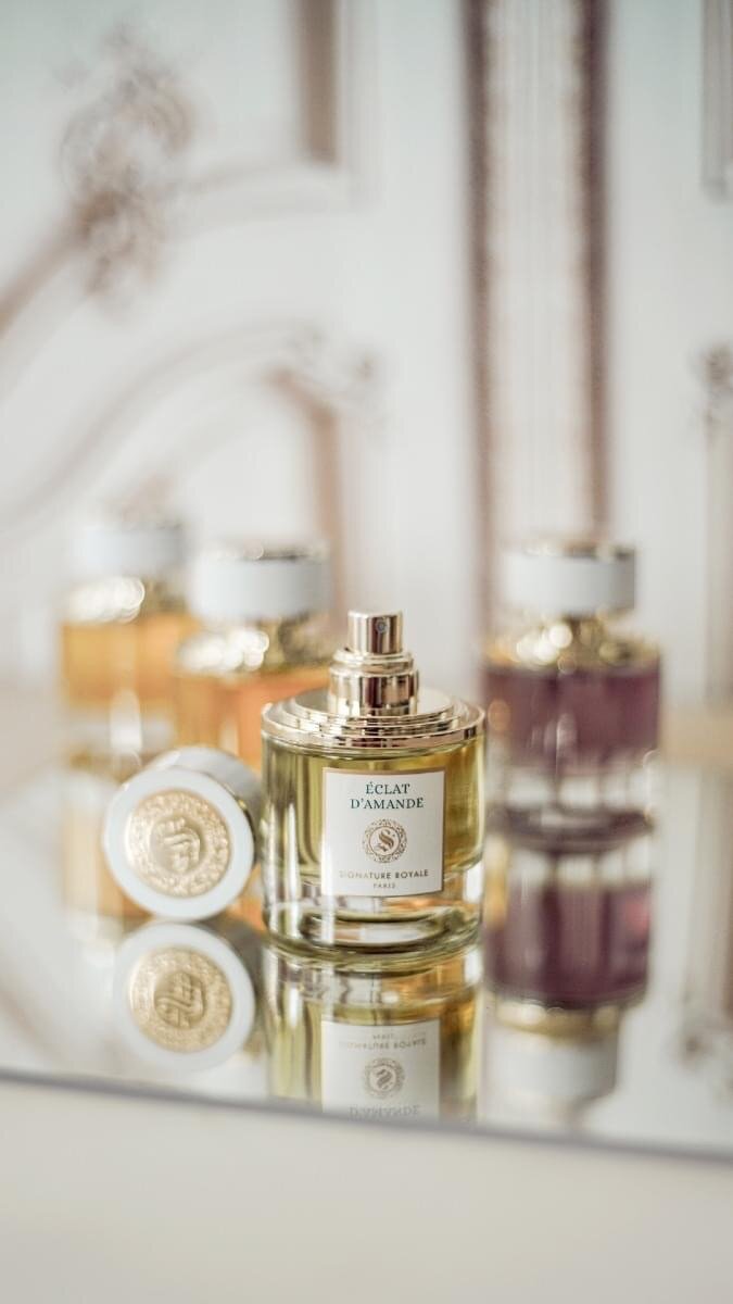 Découvrez Éclat d'Amande, un parfum sophistiqué mêlant framboise, amande et génévrier. Création florale boisée pour une élégance inoubliable.
