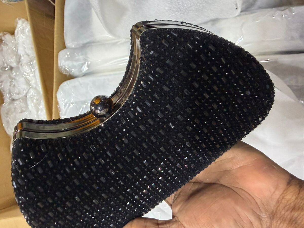 Découvrez notre clutch élégant orné de strass noirs, parfait pour vos soirées et événements spéciaux. Sa conception raffinée accentuée par une fermeture dorée ajoute une touche de glamour à votre tenue. Compact et chic, ce sac à main est l'accessoire idéal pour celles qui aiment briller.