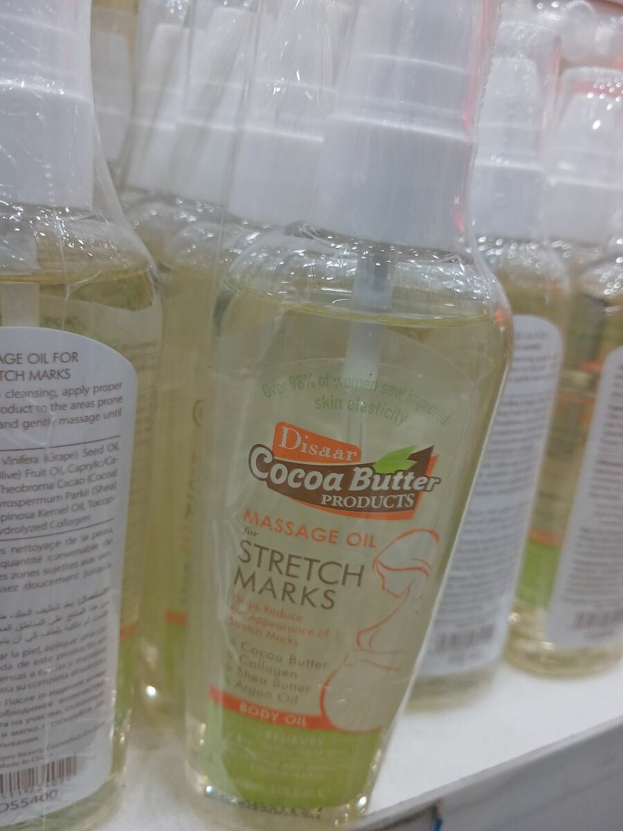 Nourish your skin with Disaar Cocoa Butter Massage Oil, designed for reducing stretch marks. Ideal for pregnancy and weight change, this oil deeply hydrates and soothes. Perfect for a relaxing self-care routine.