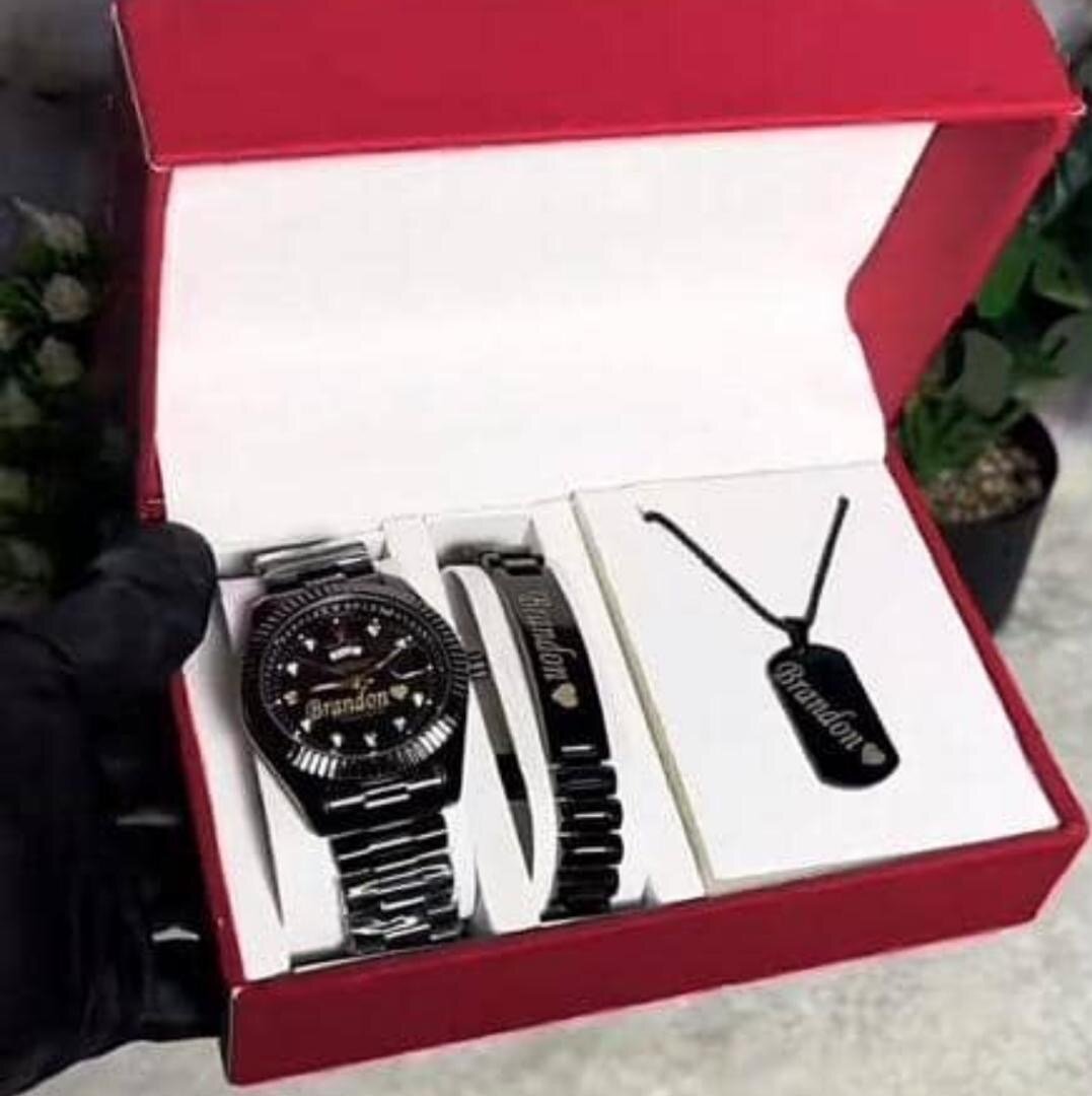 Élégant coffret cadeau pour homme comprenant une montre en acier inoxydable, un bracelet assorti et un pendentif. Parfait pour les occasions spéciales, style sophistiqué et moderne.