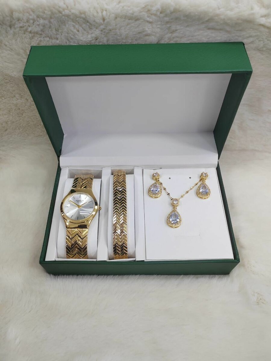 Élégant coffret cadeau incluant une montre dorée et un ensemble de bijoux étincelants. Idéal pour les occasions spéciales, ce set rehausse instantanément n'importe quelle tenue. Parfait pour offrir et se faire plaisir.