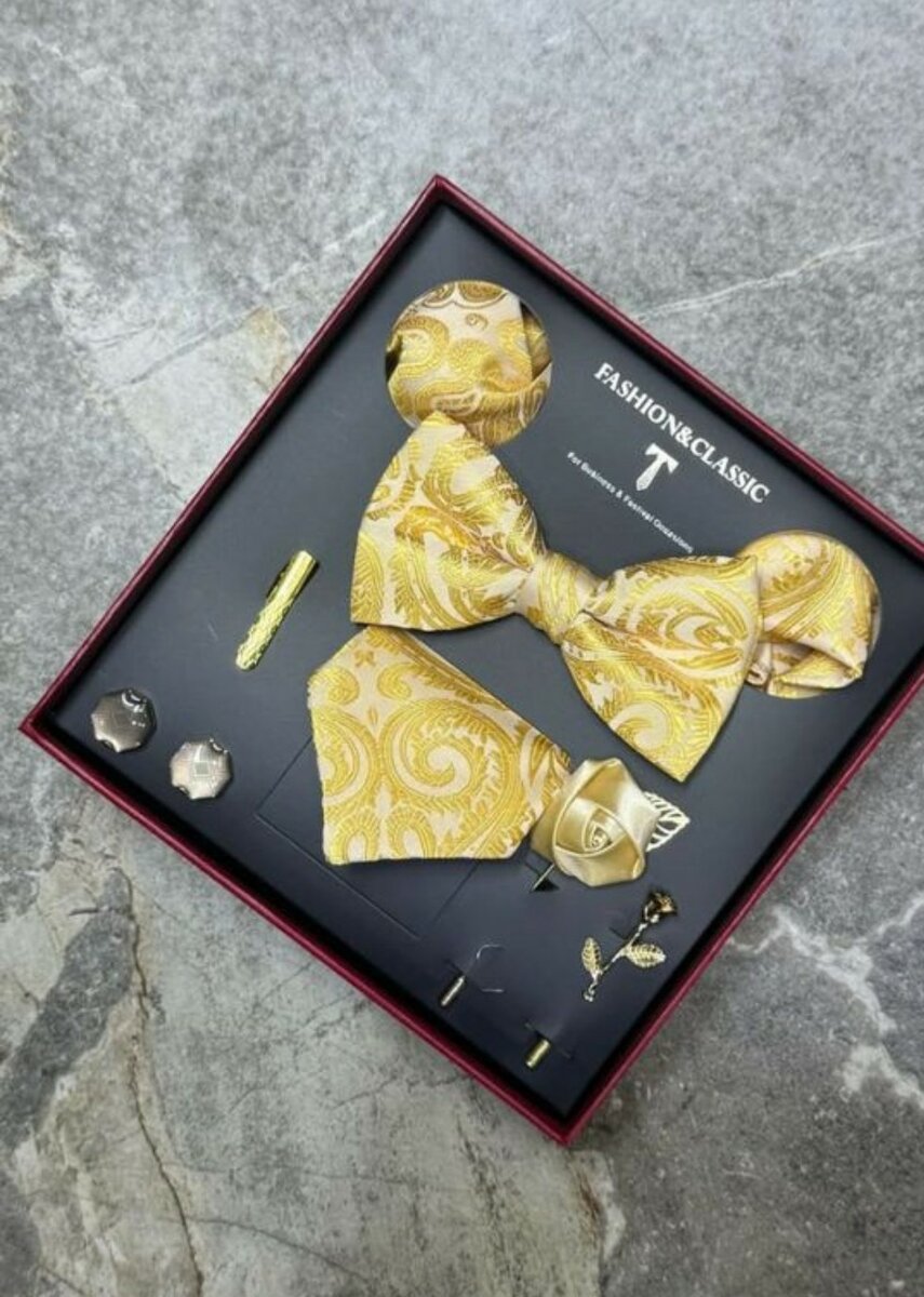 Ce coffret d'accessoires est idéal pour les hommes à la recherche d'une allure élégante et sophistiquée. Comprenant nœud papillon, cravate, mouchoir de poche et boutons de manchette assortis, il est parfait pour les événements formels. Matériaux de qualité supérieure avec des motifs uniques, ce set rehausse n'importe quelle tenue. Offrez-le à vous-même ou à un être cher pour une occasion spéciale.