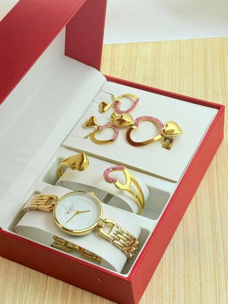Coffret montre dorée, bracelet, bagues et boucles strass. Élégant pour événements, soirées ou cadeaux spéciaux.
