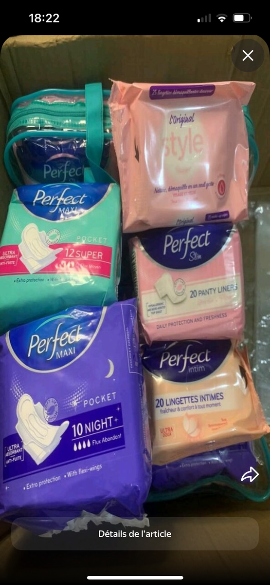 Découvrez le coffret soins féminins Perfect pour un confort optimal. Comprend des serviettes hygiéniques nocturnes, des protège-slips ultra-fins et des lingettes intimes. Idéal pour une hygiène quotidienne et discrète. Parfait pour la maison ou en déplacement.