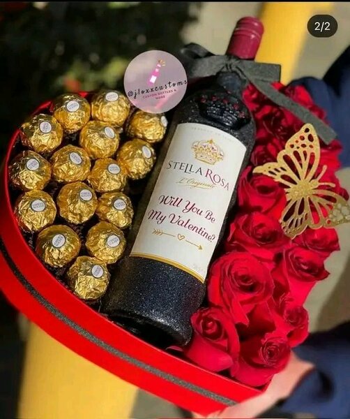 Un cadeau idéal pour les amoureux : vin rouge Casillero del Diablo, chocolats Ferrero Rocher, roses artificielles et verre personnalisé.