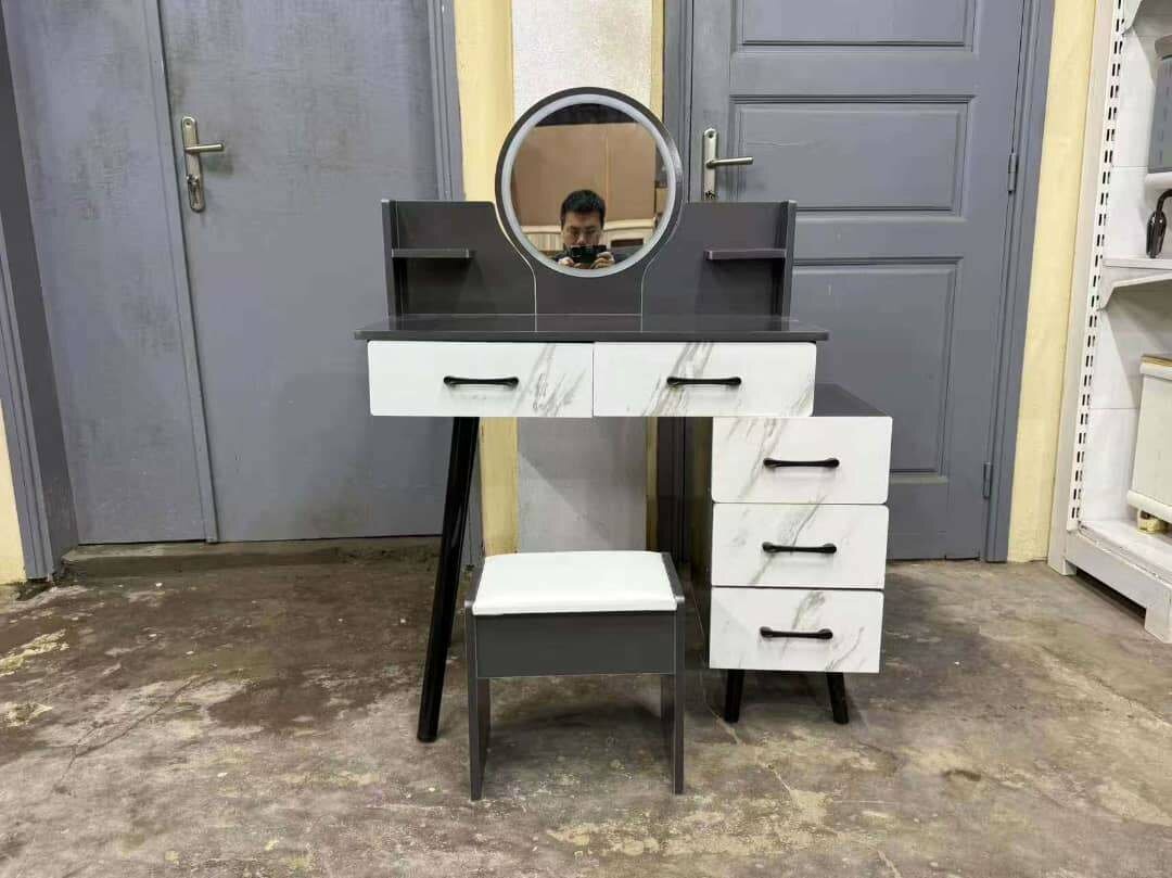 Ajoutez une touche d'élégance à votre chambre avec cette coiffeuse moderne. Dotée de plusieurs tiroirs pour un rangement optimal et un miroir rond élégant, elle est parfaite pour votre routine beauté quotidienne. Fabriquée avec des matériaux de qualité, elle combine style et fonctionnalité. Idéale pour toute chambre moderne ou contemporaine.