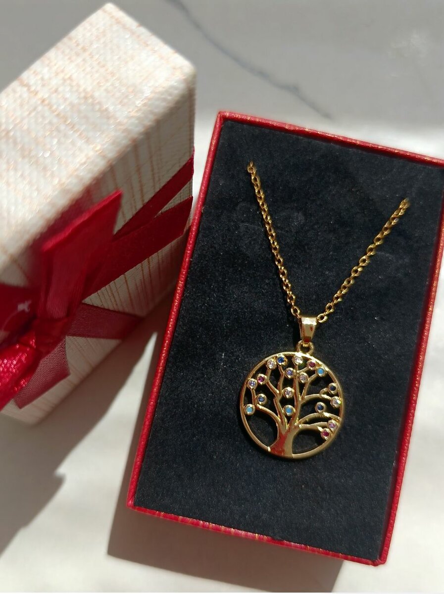 Élégant collier pendentif arbre de vie doré, parfait pour toute occasion. Bijou symbolique et raffiné, idéal comme cadeau.