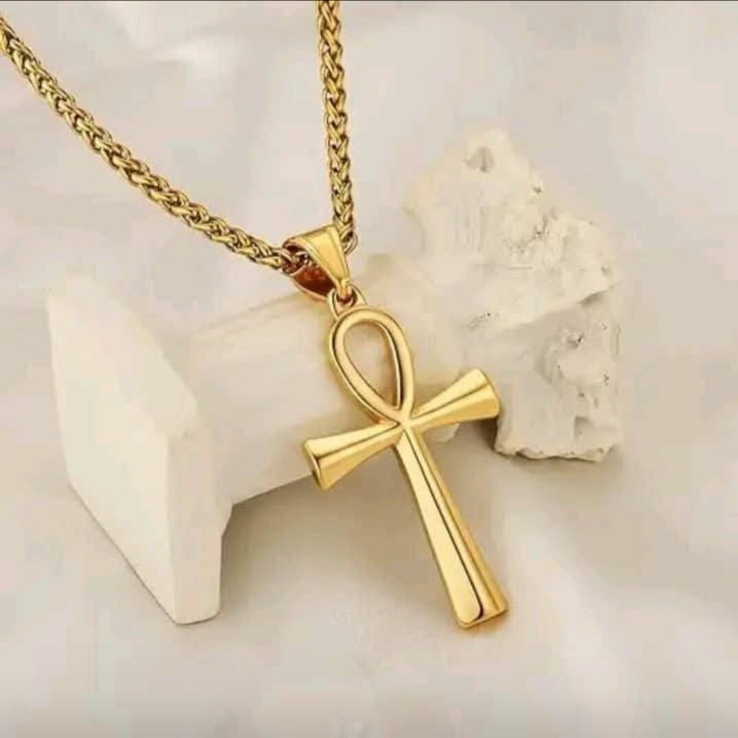 Collier avec pendentif en forme de croix ansée ou de carte de l'Afrique. Chaîne en métal doré. Idéal pour un look tendance et élégant.