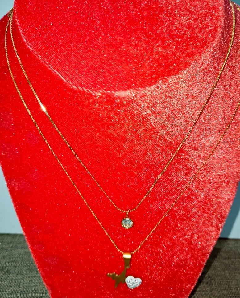 Ajoutez une touche d'élégance à votre look avec ce collier double doré au pendentif étoile et coeur. Parfait pour les occasions spéciales et les tenues quotidiennes, ce bijou versatile est un incontournable pour compléter votre collection personnelle.