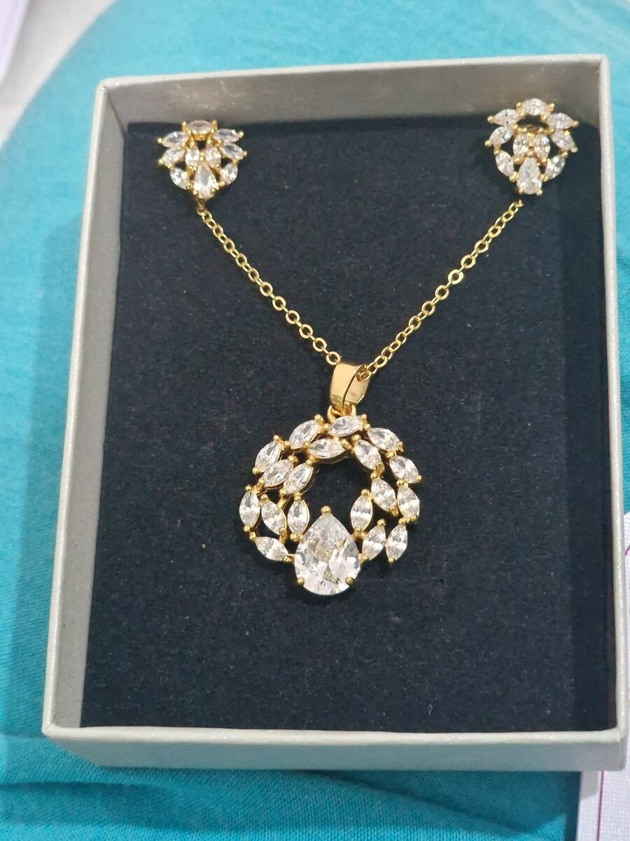Ensemble de bijoux dorés avec pendentif et boucles d'oreilles en forme de goutte ornés de cristaux étincelants. Parfaits pour des occasions spéciales ou comme cadeau inoubliable. Apportez une touche de sophistication à votre tenue.