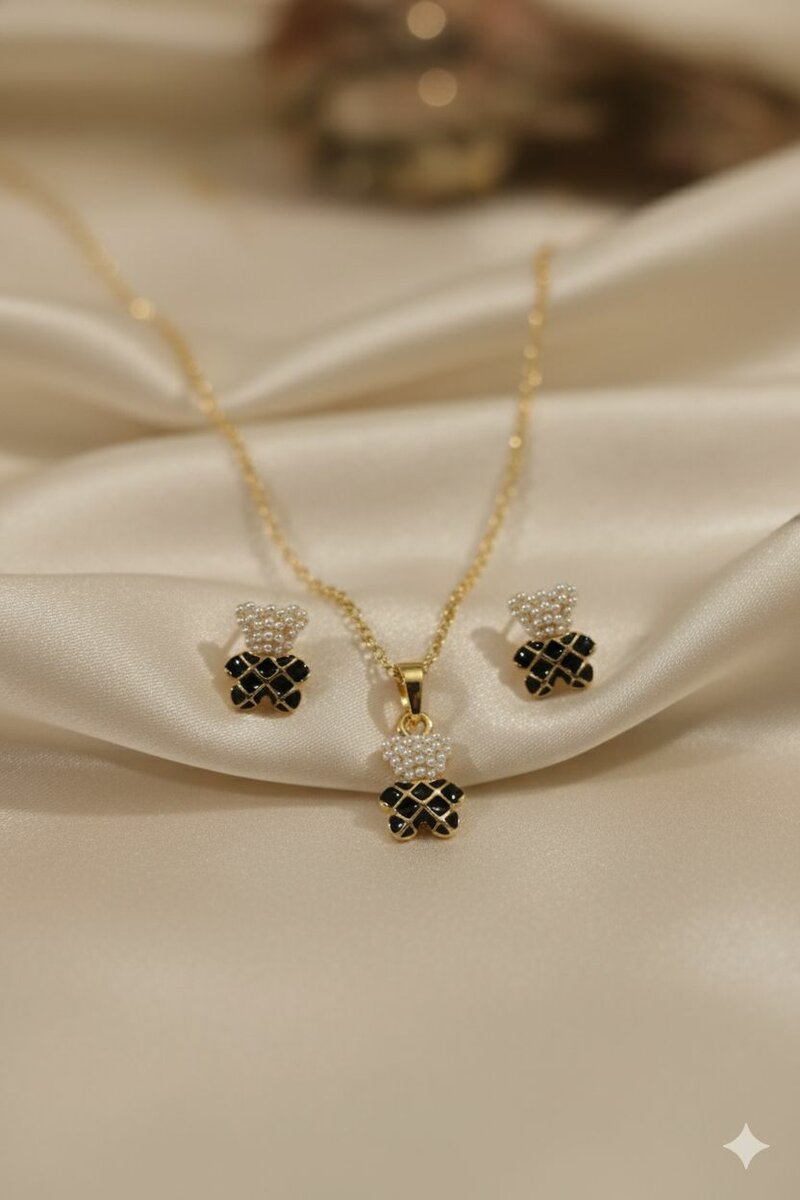 Élevez votre style avec ce set chic de collier et boucles d'oreilles, ornés de détails noirs et dorés