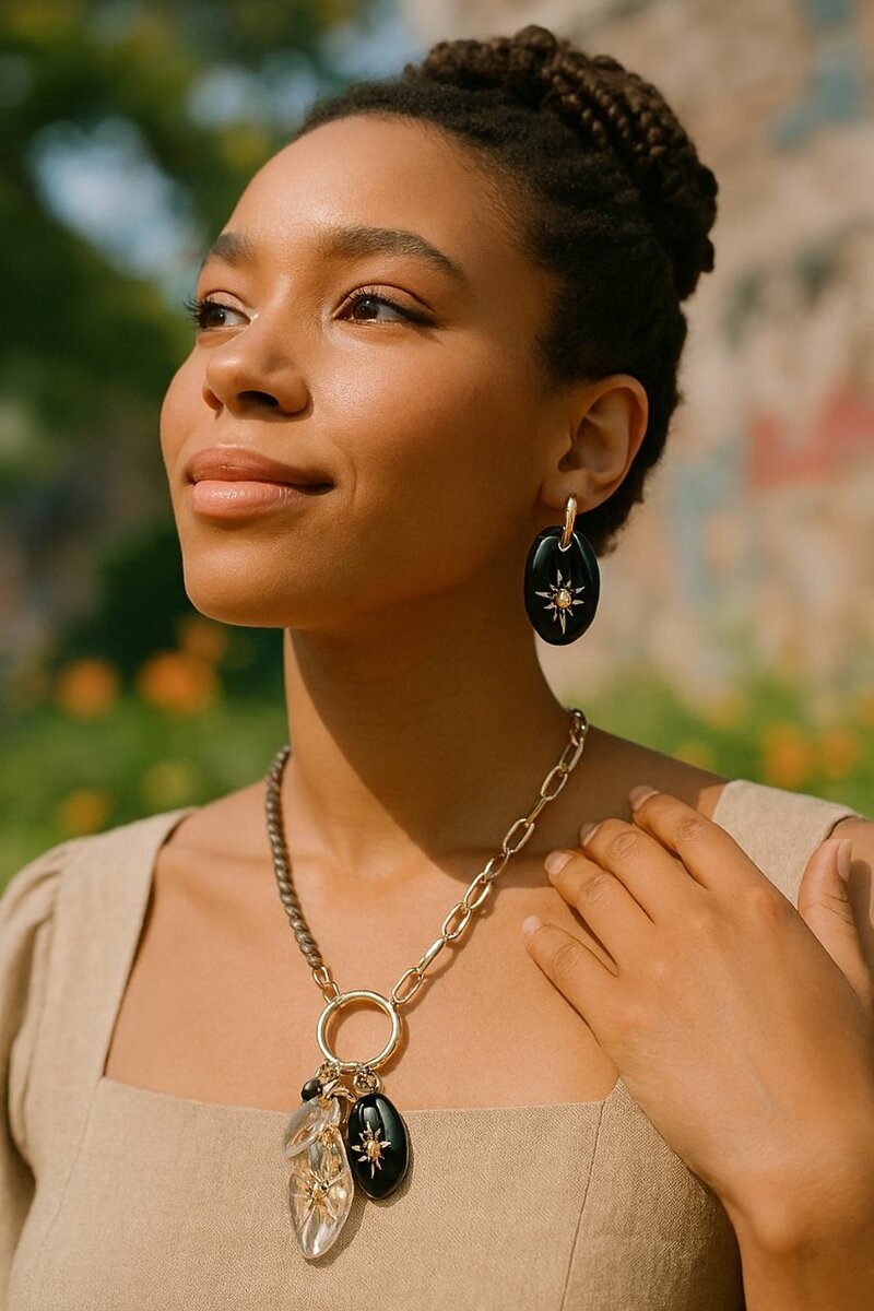 Élevez votre style avec cet ensemble collier et boucles d'oreilles. Le design audacieux et les finitions méticuleuses apportent une touche de sophistication à toute tenue. Idéal pour les occasions spéciales ou pour ajouter une touche chic à votre quotidien. Un accessoire incontournable pour une garde-robe élégante et moderne.