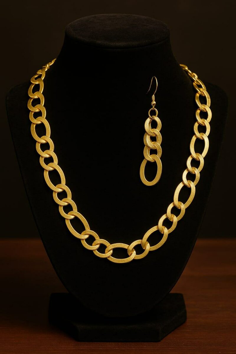 Magnifique ensemble de bijoux en or, comprenant un collier et des boucles d'oreilles. Ce design raffiné ajoute une touche d'élégance à toute tenue. Idéal pour les occasions spéciales ou un cadeau mémorable.