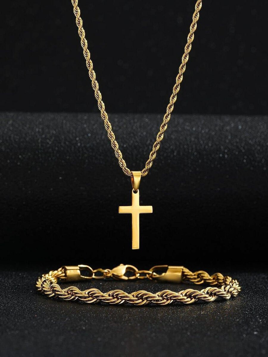 Ensemble élégant de collier et bracelet en or avec pendentif croix. Idéal pour ajouter une touche de sophistication à toute tenue. Fabriqué en matériaux durables et de haute qualité, parfait pour les occasions spéciales ou un usage quotidien. Offrez un style intemporel avec cet ensemble polyvalent.