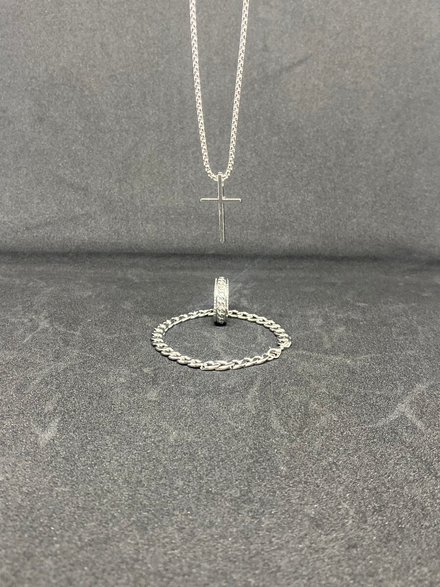 Élégant ensemble de collier avec pendentif croix et bracelet chaîne en argent. Idéal pour ajouter une touche sophistiquée à vos tenues. Parfait pour un usage quotidien ou pour des occasions spéciales.