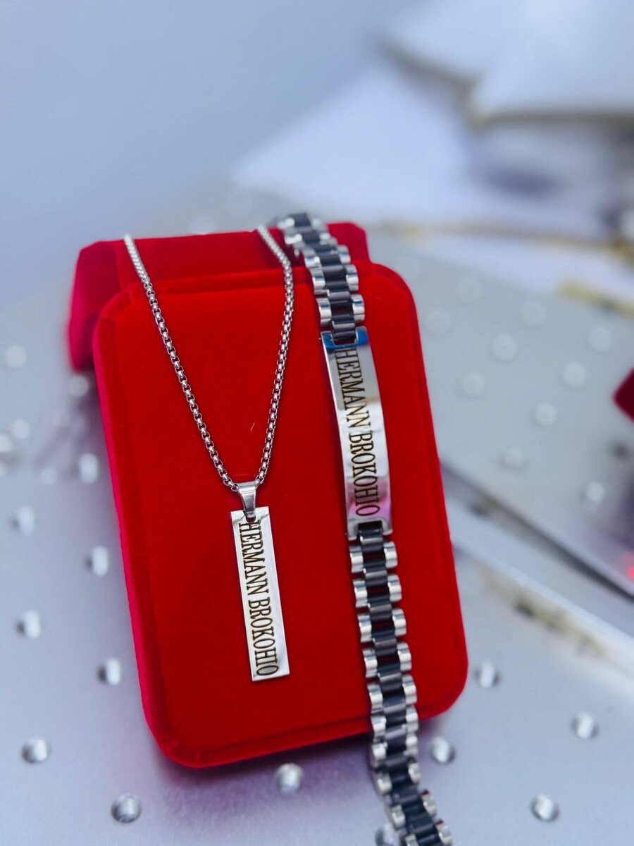 Découvrez notre ensemble de collier et bracelet en métal brillant, gravés pour une touche personnelle unique. Parfait pour un style élégant et moderne.
