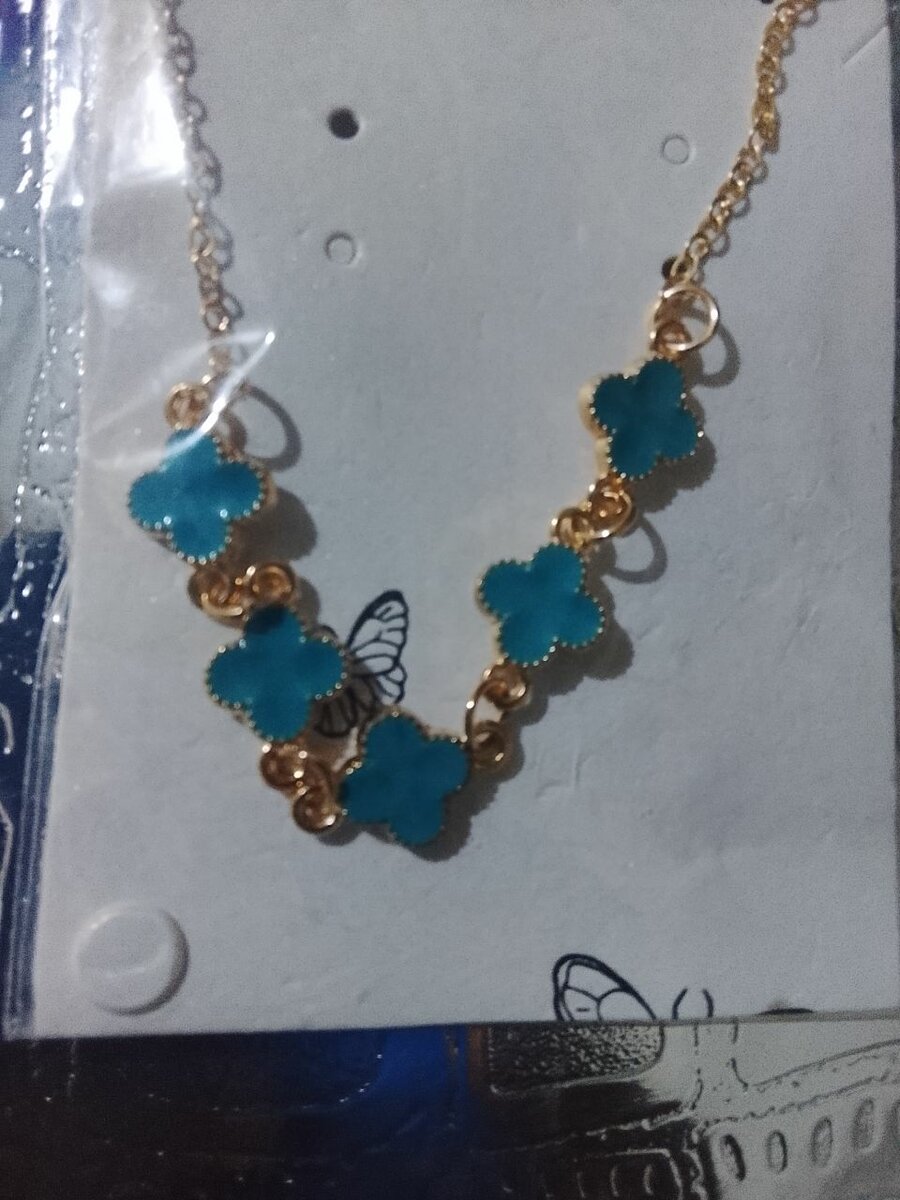 Collier en or avec des fleurs bleues et papillon. Un accessoire élégant et raffiné pour une tenue chic. Parfait pour les occasions spéciales.