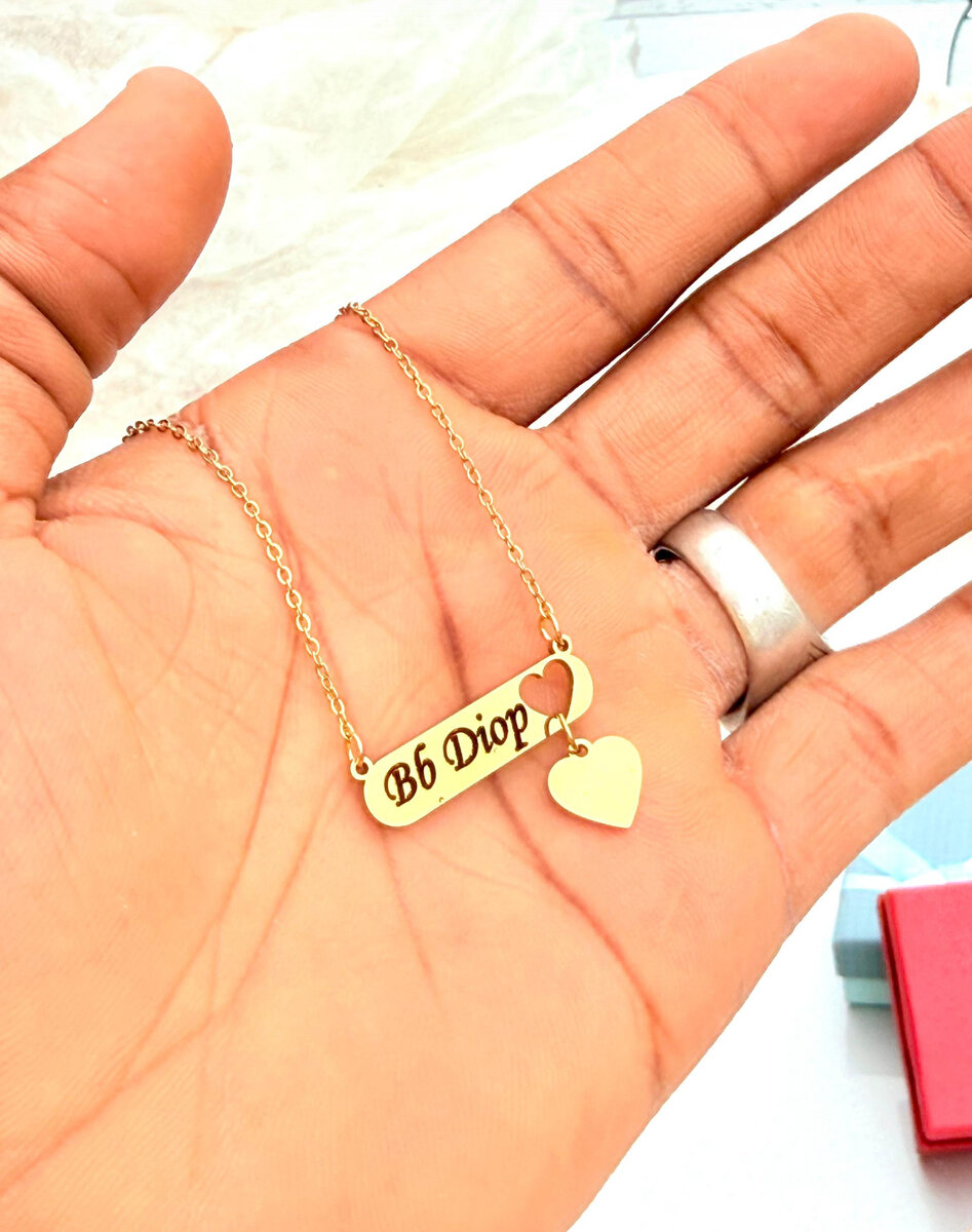 Exprimez votre amour avec ce collier pendentif cœur personnalisable. Parfait pour offrir un cadeau unique avec un nom gravé. Fabriqué avec soin, il ajoutera une touche d'élégance à toute tenue. Idéal pour anniversaires, fêtes spéciales ou juste pour dire 'je t'aime'.