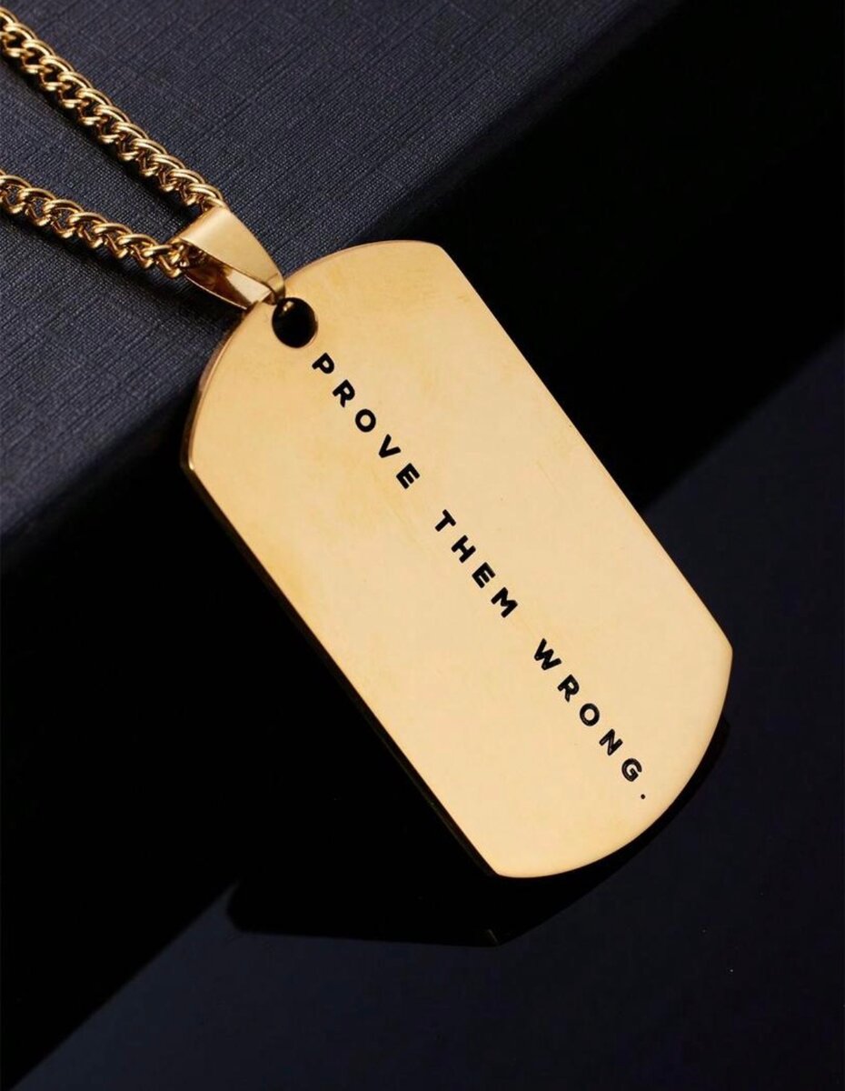 Un accessoire élégant et motivant. Ce pendentif en métal doré avec la phrase 'PROVE THEM WRONG' est parfait pour ceux qui veulent faire une déclaration. Idéal pour les hommes ambitieux et déterminés.