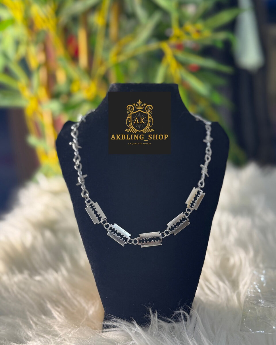 Ajoutez une touche audacieuse à votre style avec ce collier rasoir en argent. Idéal pour une tenue urbain-chic, ce bijou est parfait pour les amateurs de mode unique. Portez-le lors de soirées ou événements pour un look distinctif et moderne.