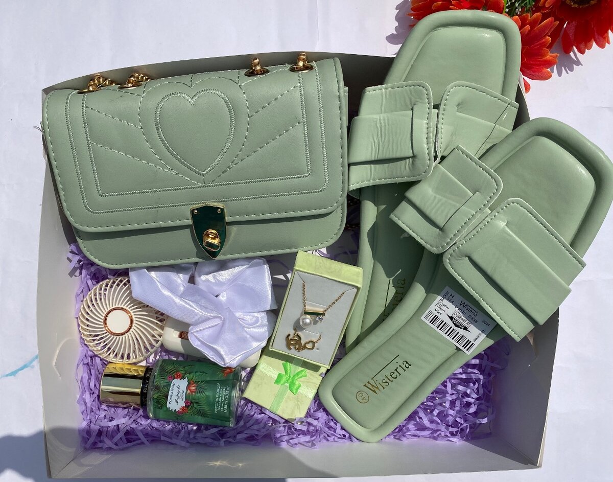 Color themed gift package for your female friend! A cute hand bag, pair of slippers to match, necklace, bracelet, hand fan, bodysplash, scrunchie and a cute card. Serves as the perfect gift package for your special friend!