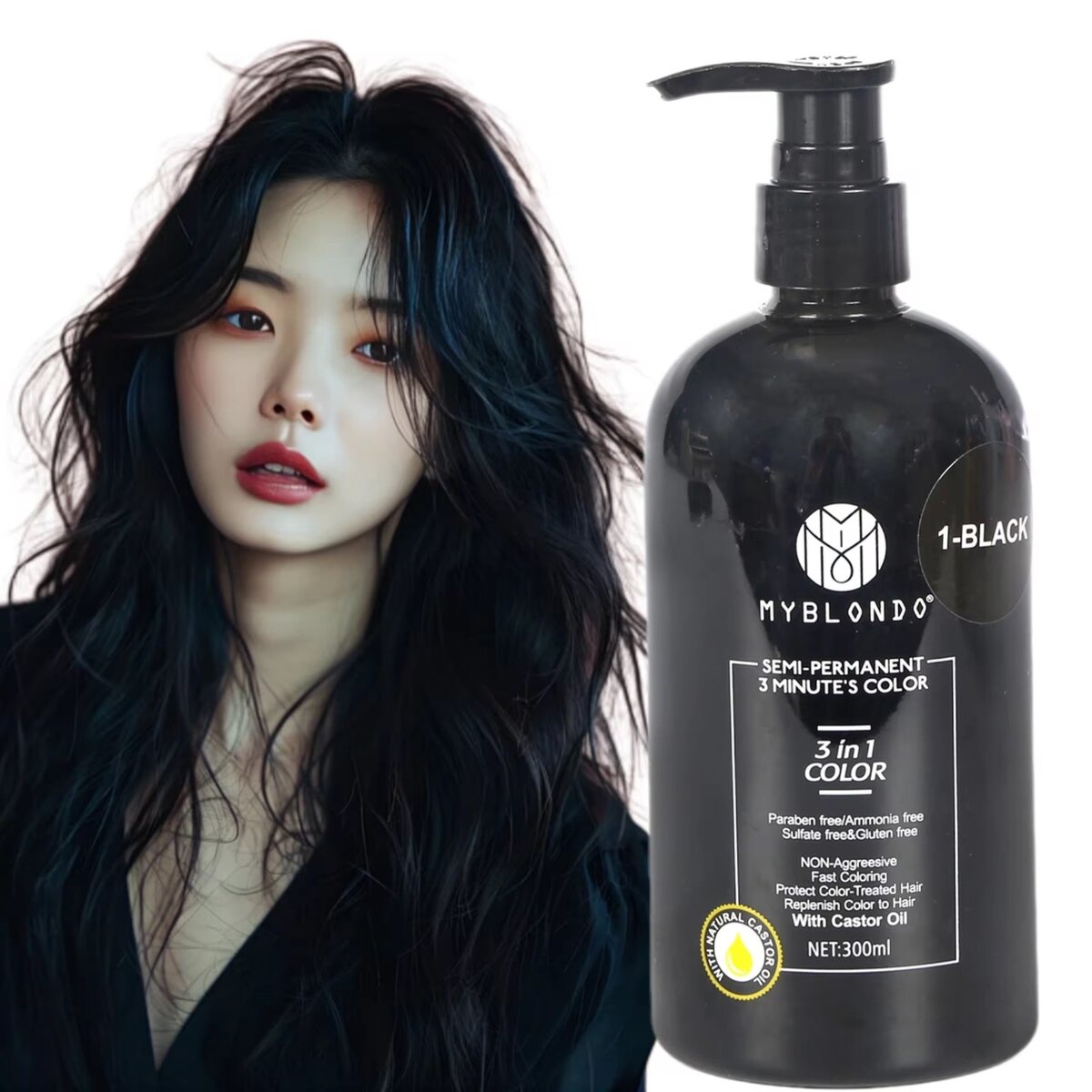 Transformez vos cheveux avec notre coloration noir semi-permanente 3-en-1 « MyBlondo ». En seulement 3 minutes, obtenez une couleur vibrante et durable sans ammoniaque. Enrichi à l'huile de ricin, il protège vos cheveux tout en leur donnant une brillance éclatante. Idéal pour ceux qui veulent un changement rapide et efficace. Adapté à tous les types de cheveux.